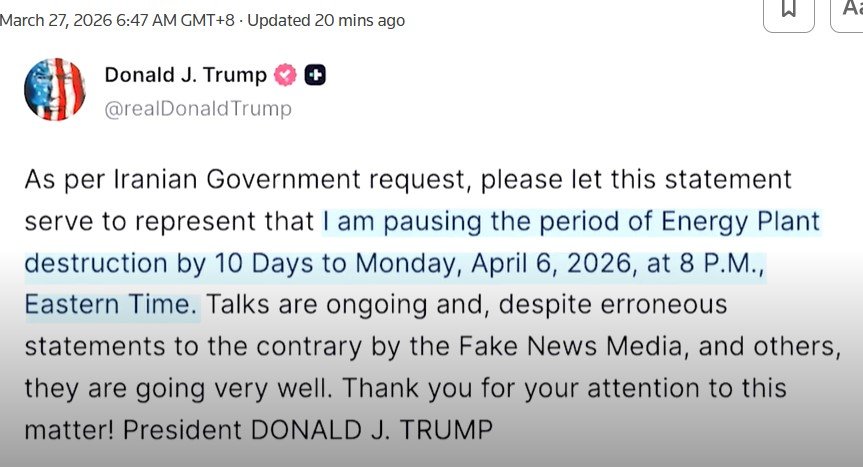 Dalam unggahan di media sosial Truth Social pada Kamis (26/3/2026), Trump menulis bahwa atas “permintaan pemerintah Iran”, ia menghentikan periode penghancuran instalasi energi Iran hingga 6 April 2026 malam waktu AS.